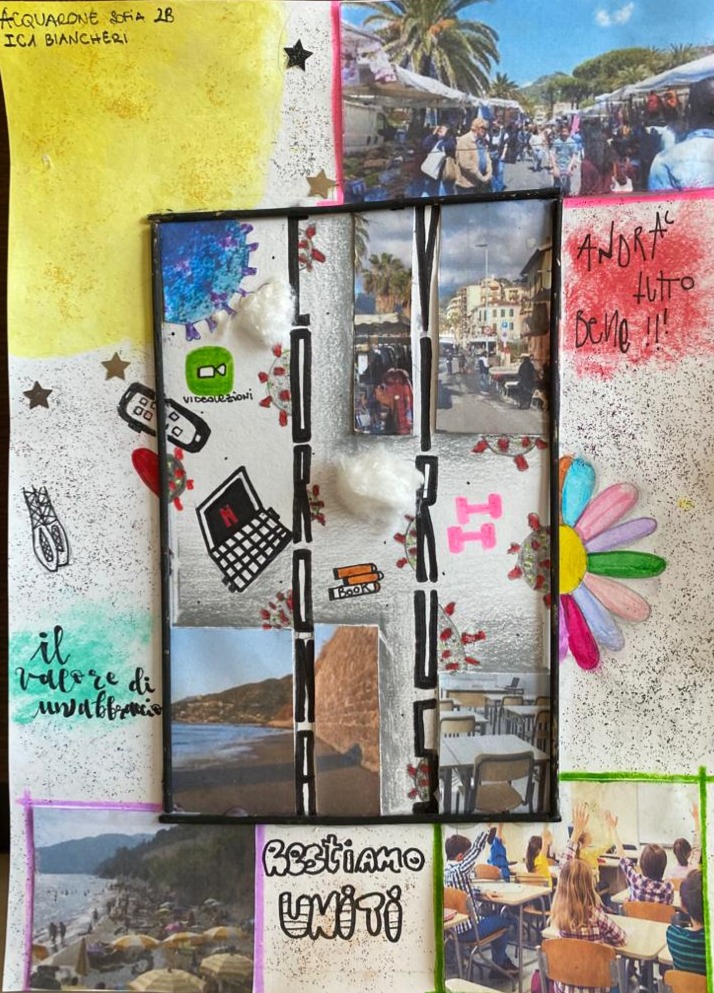 Sofia Acquarone frequenta la 2 B della Scuola Secondaria di 1°grado "Biancheri" dell'IC 1 Biancheri di Ventimiglia (IM). Lei e i suoi compagni, venuti a conoscenza dell'iniziativa dalla prof.ssa Emanuela Cananzi, coordinati dall'insegnante di Arte e Immagine, la prof.ssa Simona Lodi, ci hanno inviato i loro meravigliosi disegni. Grazie Sofia per il tuo splendido disegno e il tuo collage pieno di suggestioni. Ti auguriamo di tornare presto a scuola e di riabbracciare i tuoi compagni ed i tuoi insegnanti.