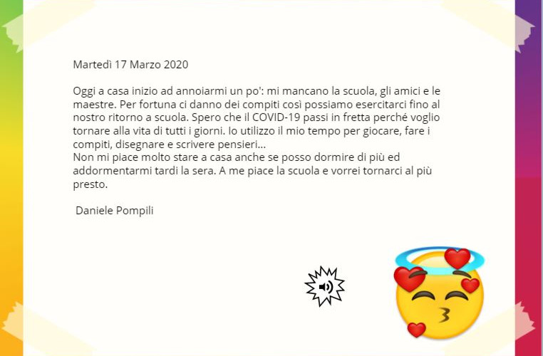 L'iBook raccoglie i pensieri e le emozioni di tutti i bambini della classe che hanno affidato a queste pagine la narrazione dei loro giorni vissuti in quarantena.
